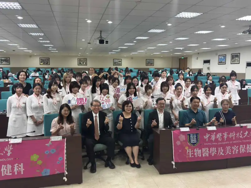 中華醫事科技大學生物醫學及美容保健系今(29)日舉行授服繫巾儀式,41位學生身穿白淨典雅的實習制服,在師長與業界貴賓見證下,繫上象徵專業與責任的彩色印花領巾,正式宣告即將邁入醫學美容產業第一線。配合儀式,系上同步舉辦實習媒合會,邀集十多家知名醫美及美容企業進場面談,提供帶薪實習機會,為學生鋪設「畢業即就業」的直通道路。