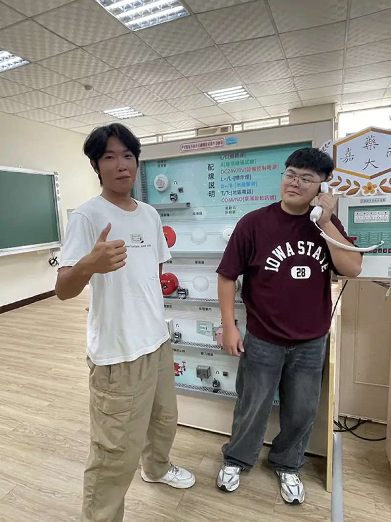 考取「消防設備士」的陳漢廷,高中時跟著爸爸從事水電工程,深刻體會到公安與消防的重要性,平日除與同學組成讀書團隊外,也常到圖書館自學教室溫習,他說到,系上國考讀書會對他幫助很多,專任教師陪讀,遇到疑問馬上提問。他特別提醒學弟妹,國考題目常與社會事件息息相關,如:百貨公司氣爆、倉儲火災及電動車自燃等事件,都應多加留意。