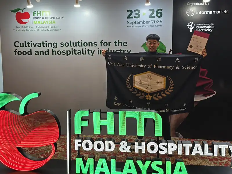 餐旅系師生同時遠赴馬來西亞,參加FHM吉隆坡廚藝大賽,該賽事是東南亞最大型廚藝賽事之一,匯聚全球飯店主廚與專業廚師團隊,王明煌老師榮獲專業組佳作,陳祐恩、黃至緯及新生張家誠各摘下佳作獎項。大一張家誠在確定錄取嘉藥餐旅後,便開始進校準備,他表示,儘管賽前投入時間研究菜譜及練習,但現場面對評審走動及計時器倒數的壓力,又是完全不一樣的感受,這次國際比賽對他來說是相當難得的體驗,也讓他更堅定投入餐飲專業的志向。