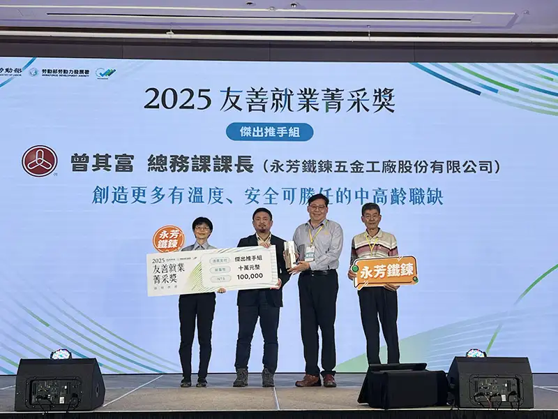 其中,璨揚企業推動「寶寶列車」制度,鼓勵同一家族成員共同任職,並增設減壓地墊及輔具設備,降低久站作業負擔,同時協助中高齡員工進行生涯規劃,展現企業深耕人本關懷的用心;發得科技建立成熟的回聘制度,中高齡員工留任率高達98%,並引進日本顧問團隊優化生產流程,促進經驗傳承,有效提升整體效率與職場氛圍;瑞泰照護中心則導入個人化輔具與AI系統,減輕照護人員工作負荷,並由營養師統籌員工餐食設計,打造兼具科技與人本的友善照護環境。