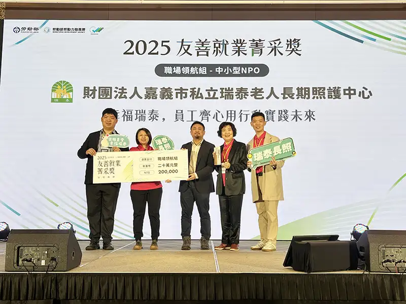 財團法人嘉義市私立瑞泰老人長期照護中心榮獲勞動部「2025友善就業菁采獎非營利組織「職場領航組」殊榮。(圖/雲嘉南分署 提供)